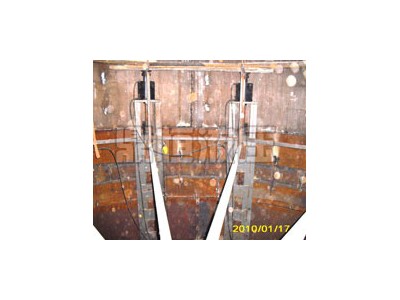 液压提升器采用自锁式液压千斤顶和提升架、提升杆组成的液压提升机,当液压千斤顶进油时,通过其上卡头卡紧并举起提升杆和胀圈,从而带动罐体(包括罐顶)向上提升;当千斤顶回油时,其上卡头随活塞杆回程,此时其下卡头自动卡紧提升杆不会下滑,千斤顶如此反复运动使提升杆带着罐体不断上升,直到预定的高度(空出下一层板的高度)。当下一层壁板对接组焊后,打开液压千斤顶的上、下松卡装置,松开上下卡头将提升杆以及胀圈下降到下一层壁板下部胀紧、焊好传力筋板,再进行提升。如此反复,使已组焊好的罐体上升,直到 后一层壁板组焊完成,从而将整个储罐安装完哔。